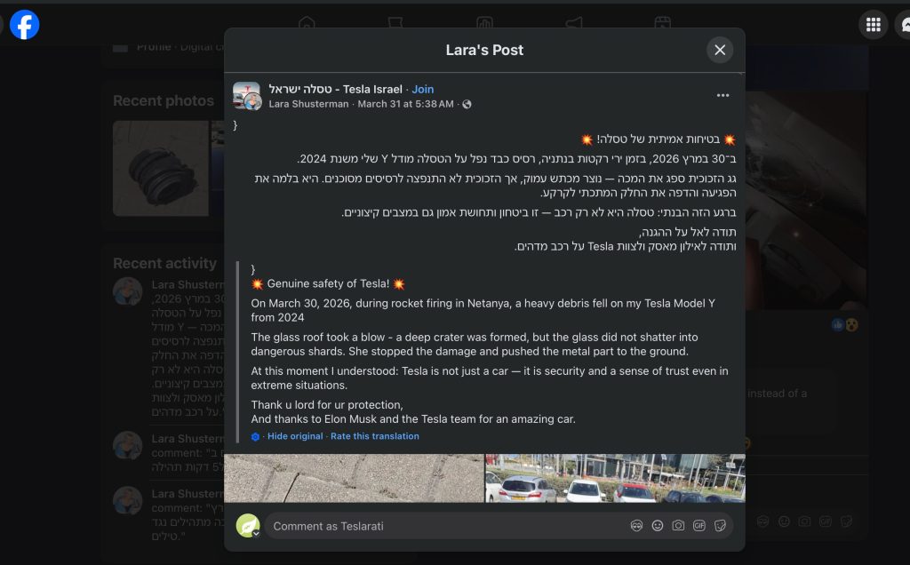 On March 30, 2026, Lara Shusterman was in Netanya, Israel when Iranian ballistic missiles triggered air raid sirens across the city. While she remained in safety, her 2024 Tesla Model Y did not escape untouched. A heavy piece of missile debris struck the car’s massive glass roof, leaving a deep crater but without shattering. In a Facebook post to the Tesla Israel community the following morning, Shusterman described what happened: “The glass did not shatter into dangerous shards. She stopped the damage and pushed the metal part to the ground.” She closed by thanking Elon Musk and the Tesla team for building what she called “security and a sense of trust even in extreme situations.”