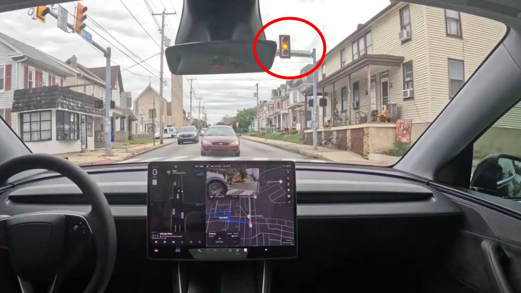 If you look at these two screenshots from when the light was yellow and red, Tesla’s driver visualization does not have any idea what traffic is to the left on Pleasant Avenue: